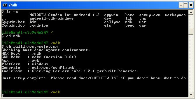 Once you verify that GNU Make was installed properly you can move forward and execute the host-setup.sh file located within the <ndk-folder>/build. Make sure to execute that file while been outside of the build directory, as shown in the following screen shot.